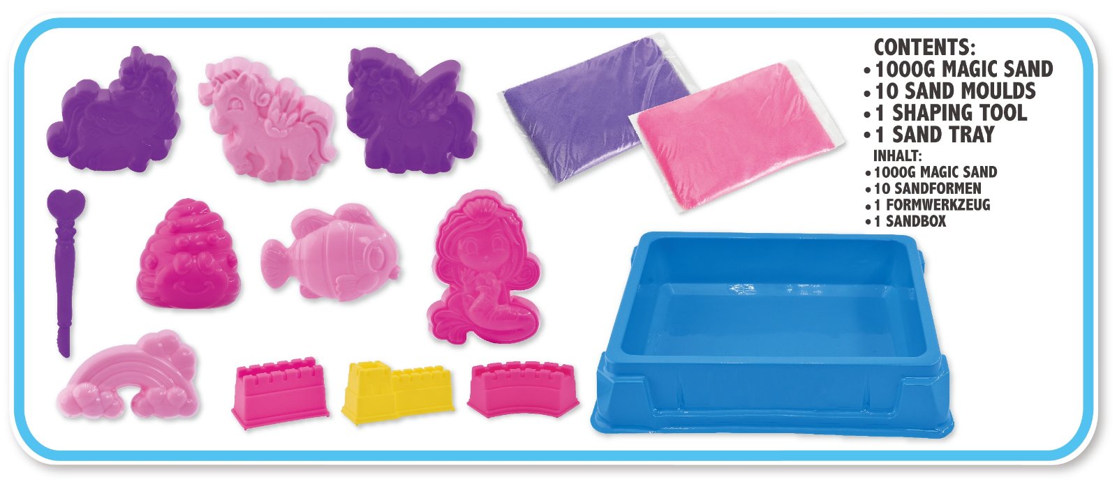 1000g magic sand (500 grams per bag)10 sand moulds1 sand tool1 sand tray