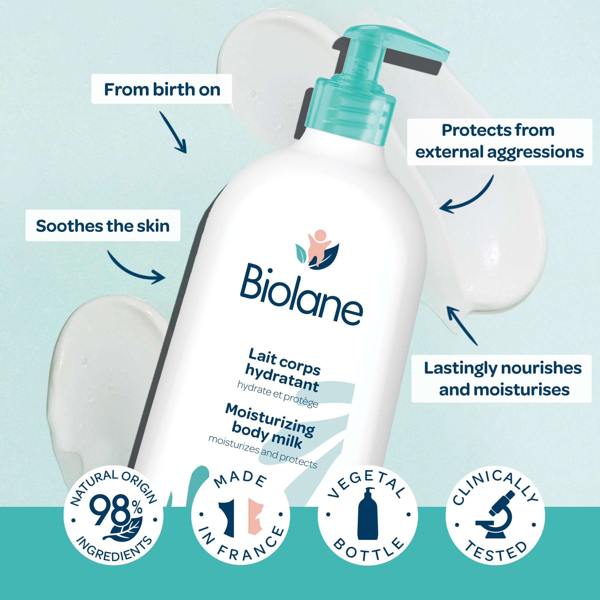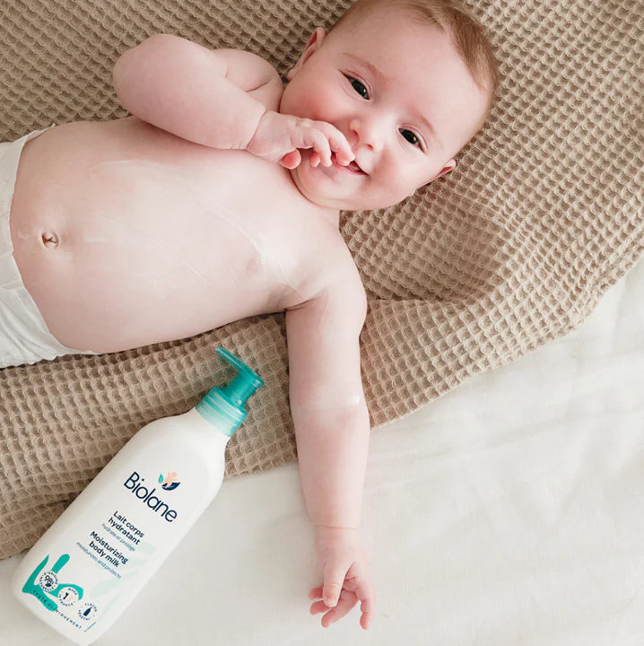 The Moisturizing body milk lastingly nourishes and soothes the baby’s skin. Its fluid and light texture penetrates quickly and doest not stick.
