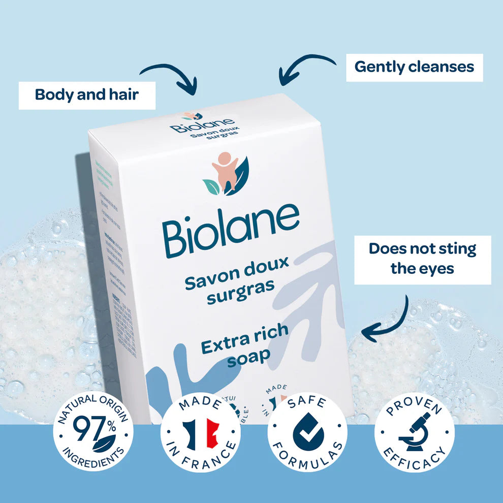 The Extra rich soap gently cleanses the baby’s skin. It leaves the skin clean, soft and lightly perfumed.