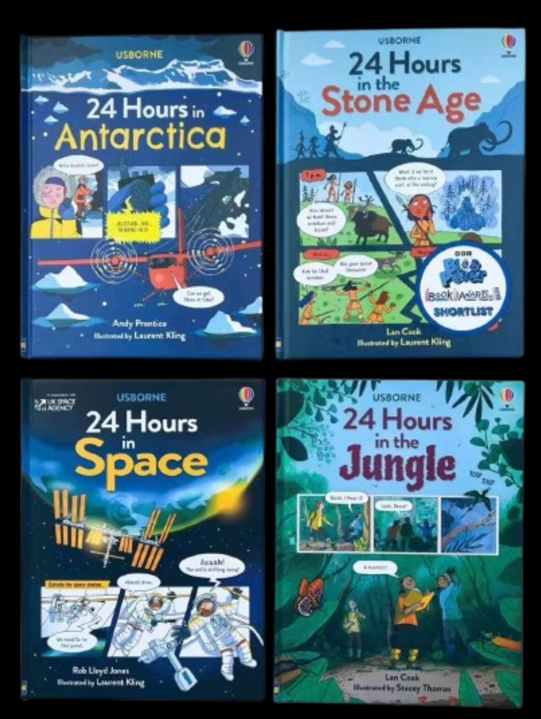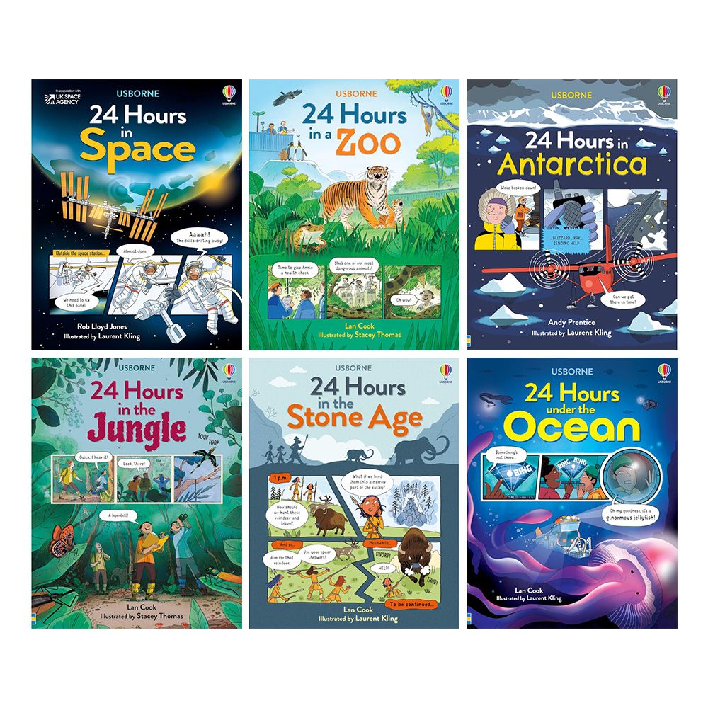 Travel around the world (and beyond!) with the Usborne 24 Hours Series. This 6-book set follows what happens over a full day in fascinating places—from space stations to jungles and oceans—through engaging illustrations and comic-style storytelling.