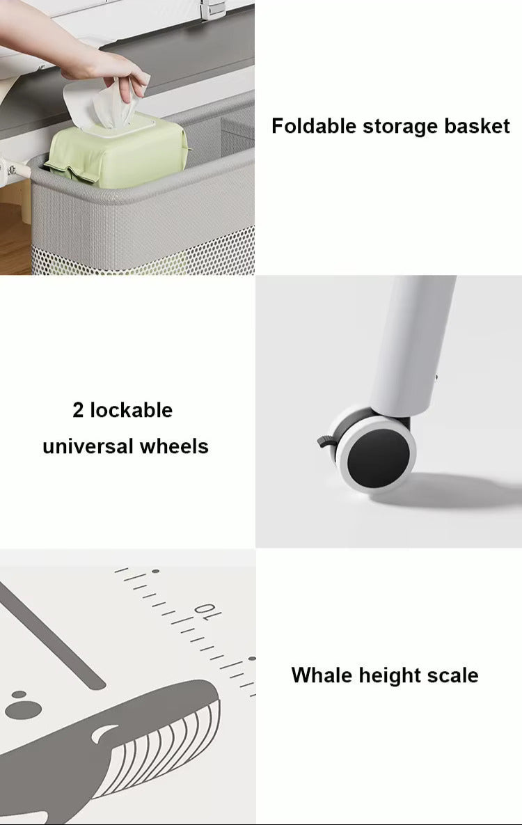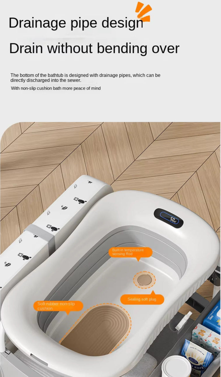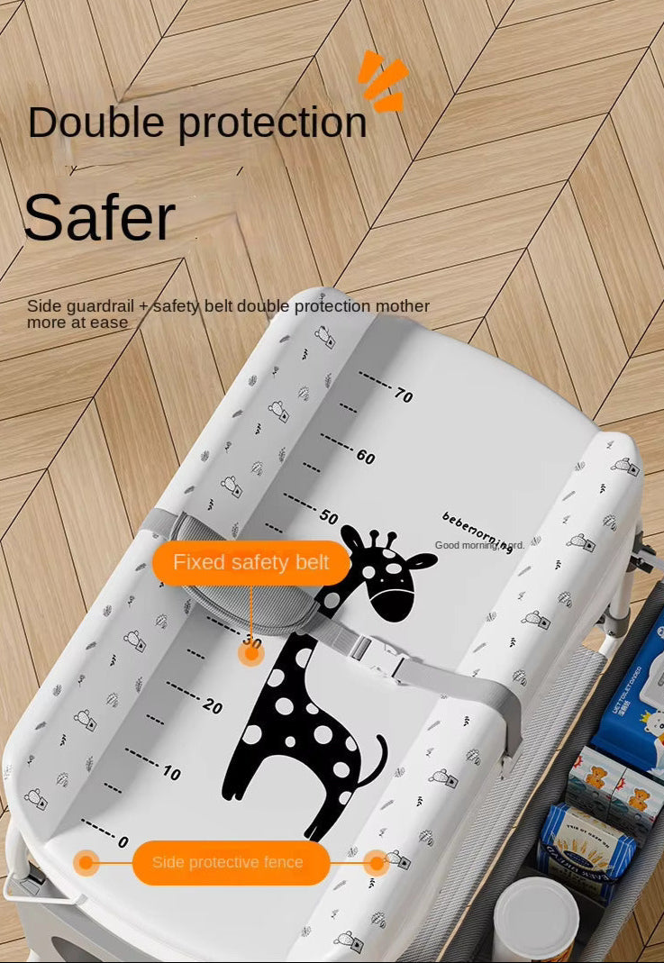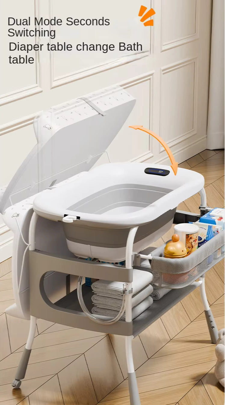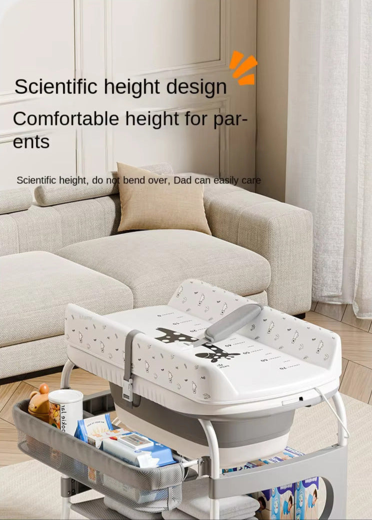 Made with a stable base structure, 2 lockable wheels, and foldable storage area for your bath and changing essentials. Comes with a bathtub and a removable diaper changing station.