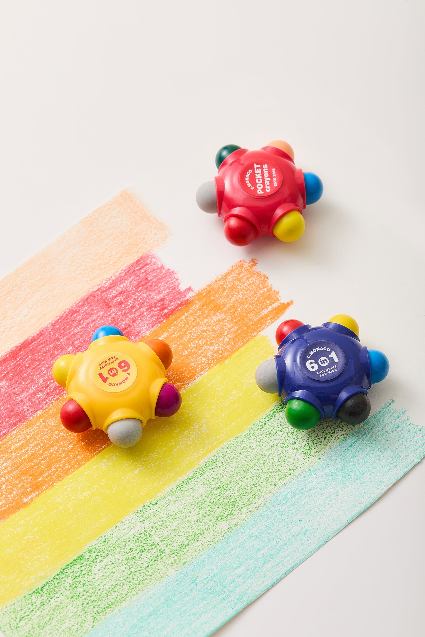 The Flower Monaco Pocket Crayons 6-in-1 Set combines creativity and convenience! Each crayon stick holds 5 colors in one tip plus a built-in eraser for easy correction. This 3-pack includes red, yellow, and blue crayons – portable, fun, and perfect for travel or school.