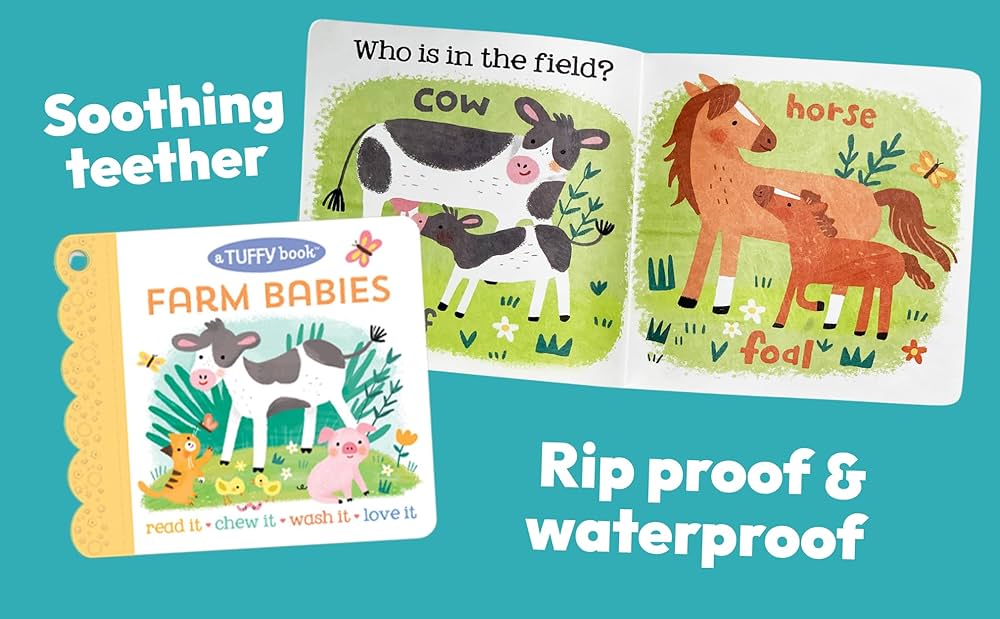 Introduce your infant or toddler to farm animals and their adorable little babies in this sweetly illustrated first book that doubles as a soothing teether. Meet precious animals found in the field, barn, pond, and garden while learning first animal words like cow and calf, duck and ducklings, horse and foal, cat and kitten, pig and piglets, and more! Playful illustrations and minimal text make this an ideal first “reading” experience for curious children that offers an array of sensory experiences that strengthen fine motor skills, hand-eye coordination, and soothes tender gums. Our durable line of Tuffy books are uniquely made to withstand the traditional wear and tear from teething babies and toddlers, BPA-free, and washable. Read it. Chew it. Wash it. Love it. That’s the Tuffy way!