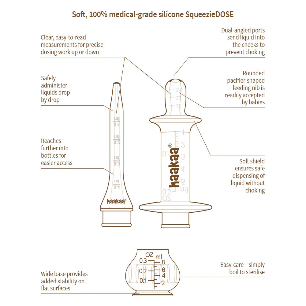 Feed your little one liquids and administer their medicine safely and easily with Haakaa's SqueezieDOSE Silicone Dispenser Set! The unique silicone bulb design is an excellent alternative to traditional hard plastic syringes. It allows you to use it one-handed, giving you effortless control over the flow rate with a simple squeeze. Designed for fuss-free measuring, filling, and feeding, the 100% medical-grade silicone SqueezieDOSE has clear measurements that are easy to read no matter which way you're holding it, and the wide base gives added stability on flat surfaces. What's more, it disassembles with no trouble at all, making cleaning a breeze. To use, just squeeze the bulb to fill, then gently squeeze again to control the flow rate for uncomplicated and comfortable dispensing of liquids! This set comes with two interchangeable syringe tips to suit your child's needs. The dropper tip releases liquid drop by drop, while the nib tip has a protective shield and dual-angled ports designed to safely administer liquids into your baby's cheeks, preventing choking.