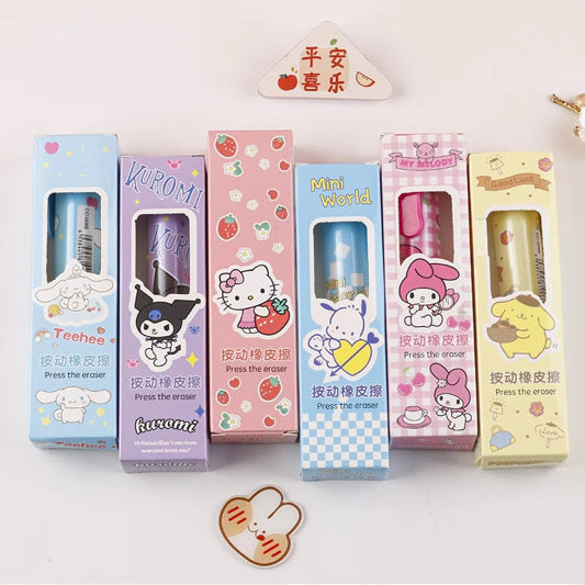 Erase mistakes in the cutest way with this Sanrio Press Eraser Pen! Designed like a pen, just press and erase—no mess, no broken erasers.