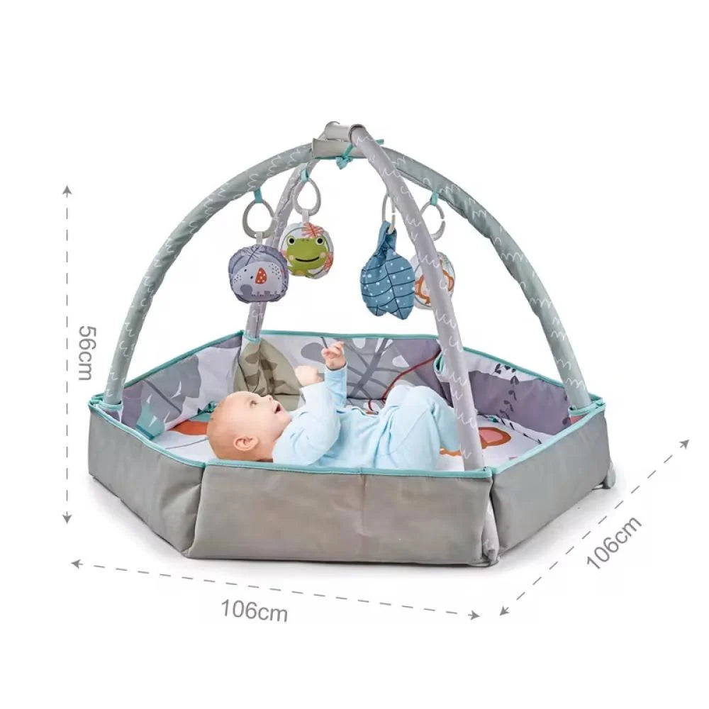 - Sensory Play Gym – Overhead toy arch with hanging plush toys for reaching and batting
