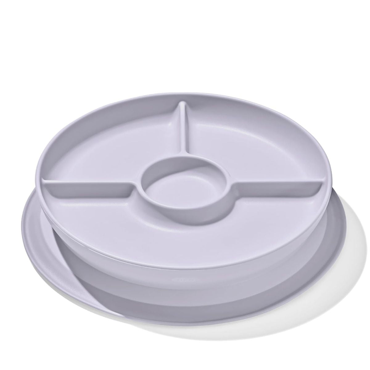 The OXO Tot Stick and Stay Divided Plate features a secure suction base that sticks firmly to surfaces until mealtime is over. The parent-friendly design makes these plates and bowls easy for grown-ups to remove, but tricky for little ones, to prevent slipping, tipping or tossing. The side walls are designed to help tots with scooping to help promote self-feeding. These dishwasher safe bowls and plates quickly twist apart for thorough cleaning.